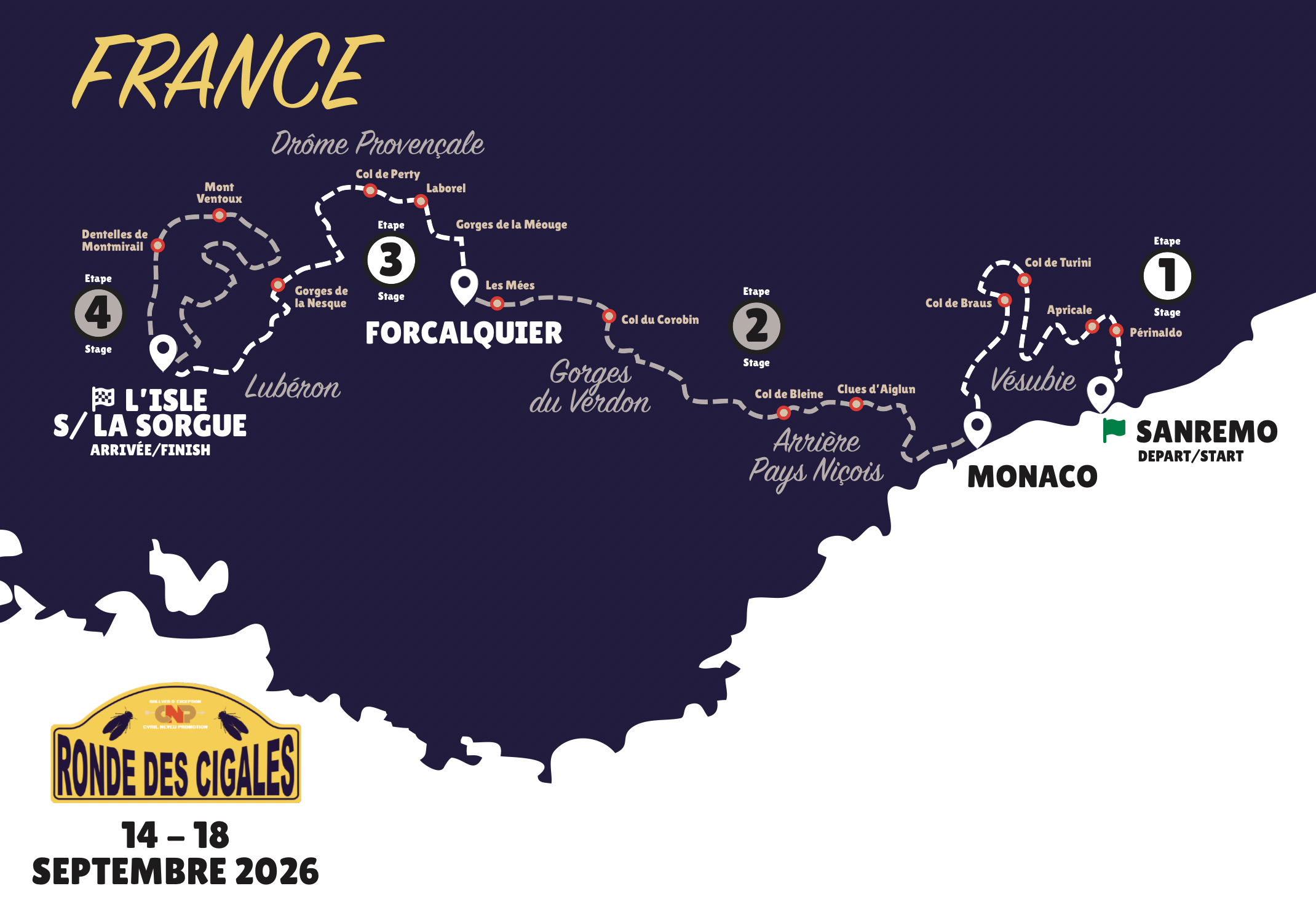 CNP vous convie à un rallye qui célèbre l’histoire et la légende des grandes épreuves automobiles, sur des routes où se sont écrites parmi les plus belles pages du sport. Depuis les rivages lumineux de San Remo, joyau de la Riviera italienne, jusqu’à l’élégante douceur de L’Isle-sur-la-Sorgue, vous traverserez des paysages chargés d’histoire et d’émotion, en passant par l’arrière-pays de Monaco, ce théâtre mythique des rallyes de Monte-Carlo, puis par les gorges du Verdon et les terres ensoleillées de la Drôme provençale. Le parcours vous mènera ensuite vers les villages et panoramas enchanteurs du Luberon, avant l’ascension majestueuse du géant de Provence, le Mont Ventoux, sommet mythique qui a marqué l’imaginaire des passionnés d’automobile et de cyclisme. Chaque étape sera rythmée par des haltes raffinées, alliant l’art de vivre à la française, les plaisirs gastronomiques et la découverte de lieux prestigieux. Plus qu’un simple itinéraire, ce rallye est une expérience rare, où le luxe des paysages se conjugue à la passion des automobiles anciennes et de prestige, dans une atmosphère d’élégance et d’émotion que seul CNP sait orchestrer.PROGRAMME DU RALLYE